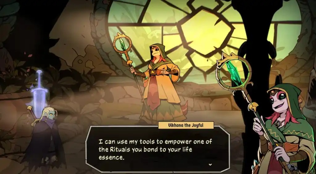 Once you’ve given Vikhana her tools, she gains the ability to appear randomly during your runs in non-boss rooms. When she does, she’ll upgrade one of your current Rituals, improving its power and effects.