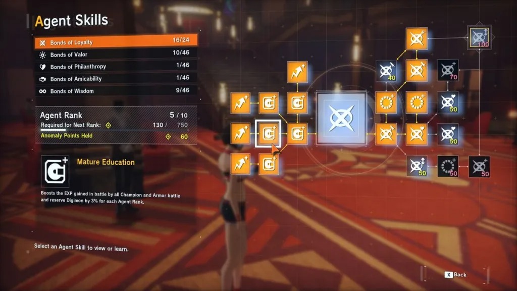 The Bonds of Loyalty tree is home to skills that increase EXP and boost overall stats. The most important ones for leveling are the Education Nodes.