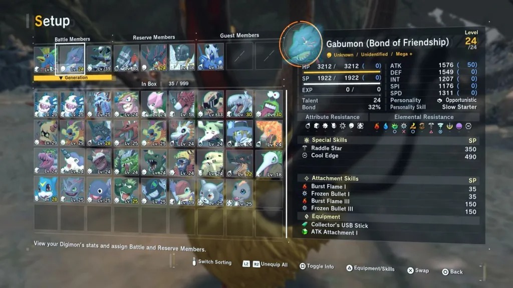 Your Digimon roster consists of Battle Members, Reserve Members, Guest Members, and Digimon stored “In Box.” Every Digimon earns experience after each fight, but the amount differs depending on their position.