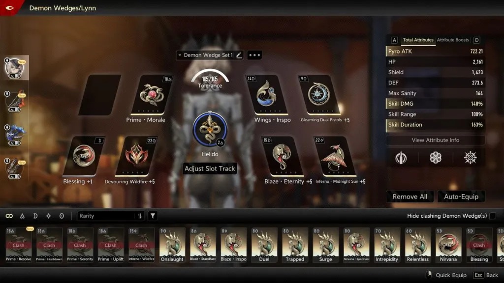 Demon Wedges act as the game’s main equipment system. Each Wedge provides unique stats or bonuses, and every character has eight available slots. However, you don’t always fill all eight because each Wedge adds to your total Tolerance—and you cannot exceed your character’s limit.