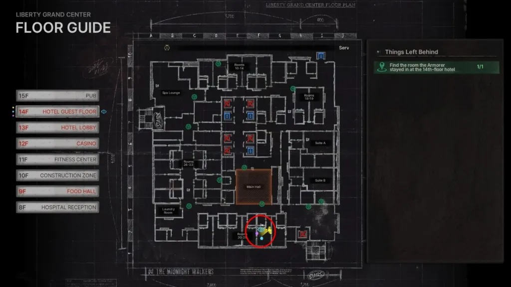 After reaching the 14th floor, open your map and head toward the Room 20–25 area, located on the southern side of the floor. Most rooms in this section have large holes in the walls, making it easy to move between them without using doors.