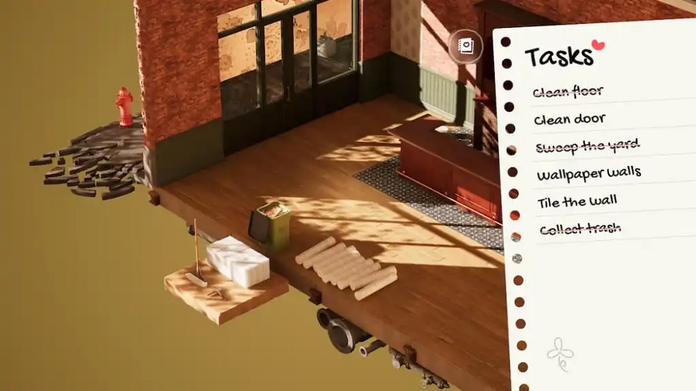 - All necessary tools and materials are provided during levels where extra tasks, like laying wooden floors or tiling walls, are required.