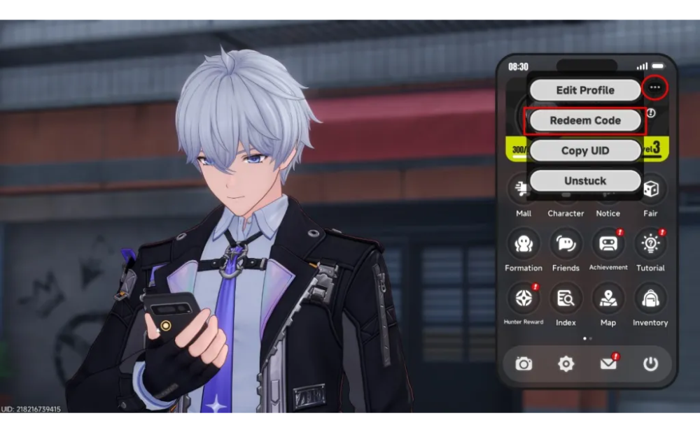 To redeem codes, press “ESC” to open your in-game phone. Once the phone interface is visible, look at the upper-right corner, just below the battery icon. Tap the “…” button to access the Redeem Code option.