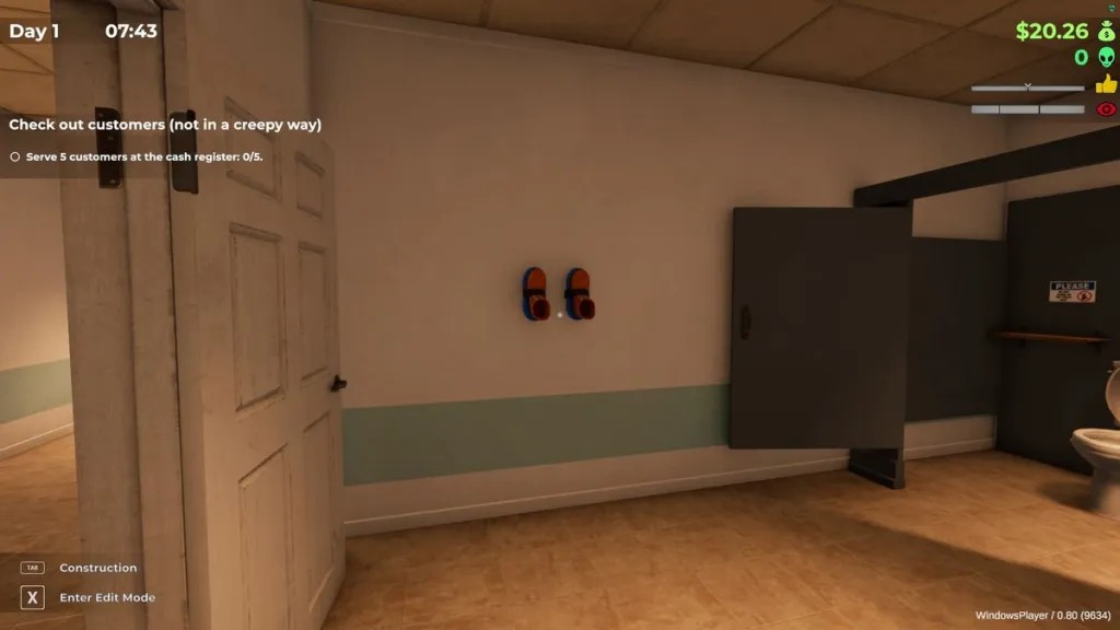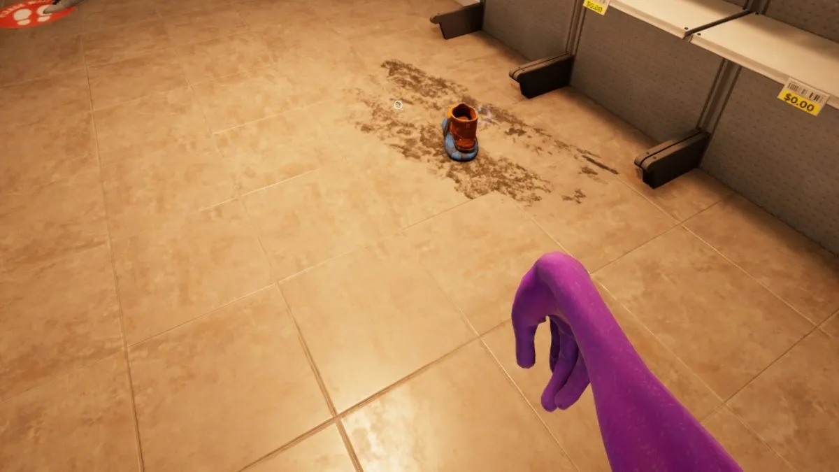 Go to the bathroom and interact with the shoe sponge. Then move to the mess, hold the left mouse button, and drag your cursor over the dirty area until it disappears. The same method works for bad smells, even though it feels a bit strange. Wipe down the toilets or clean the ground under cars near the gas pumps to remove the stench.