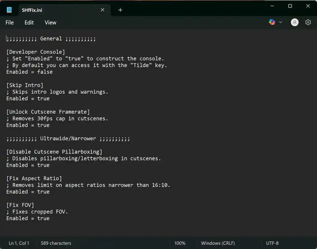 You can toggle any of these features by editing the SHfFix.ini configuration file using a text editor like Notepad or Notepad++.