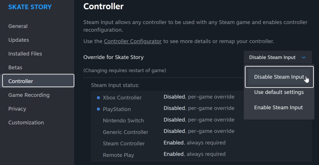- Under “Override for Skate Story,” choose Disable Steam Input